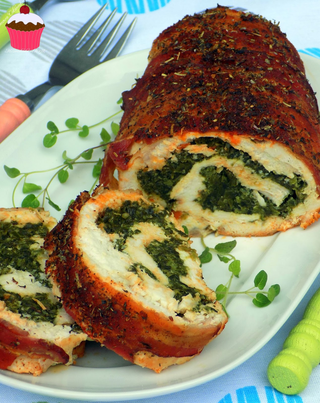 Ta rolada to moja propozycja nie tylko na świąteczny stół ale także na inne rodzinne spotkania i obiady. Przygotowuję ją często, bo smakuje nawet tym, którzy twierdzą, że nie lubią szpinaku. Można ją przygotować nawet dzień wcześniej i wstawić do lodówki a w dniu podania tylko upiec i gotowe. Jest smaczna nie tylko na ciepło ale też na zimno jako dodatek do kanapek. Mięso jest soczyste ale należy uważać, żeby go nie przepiec, bo wtedy będzie suche i niesmaczne. Z podanych składników wychodzi rolada, którą można podzielić na około 12 porcji.